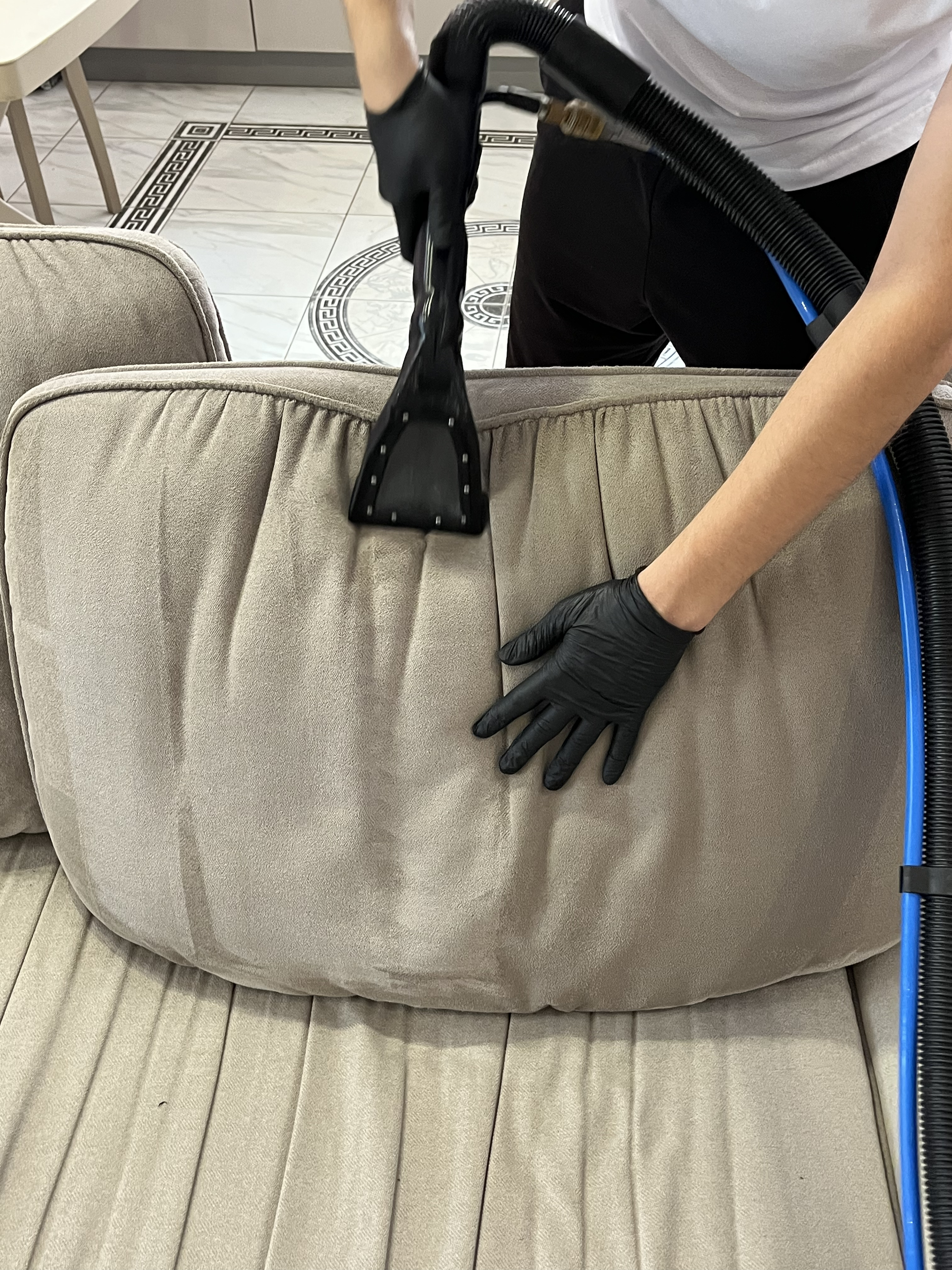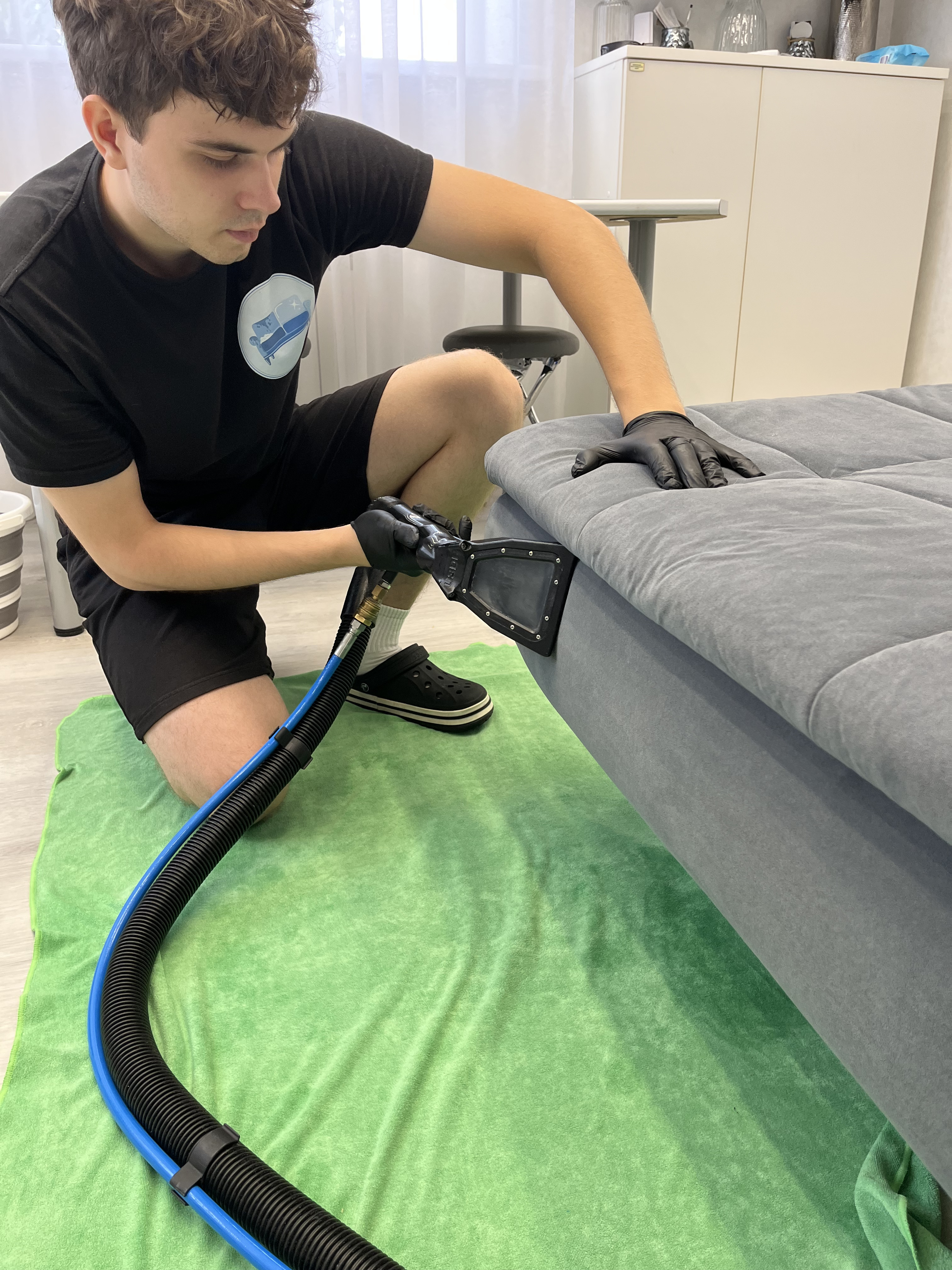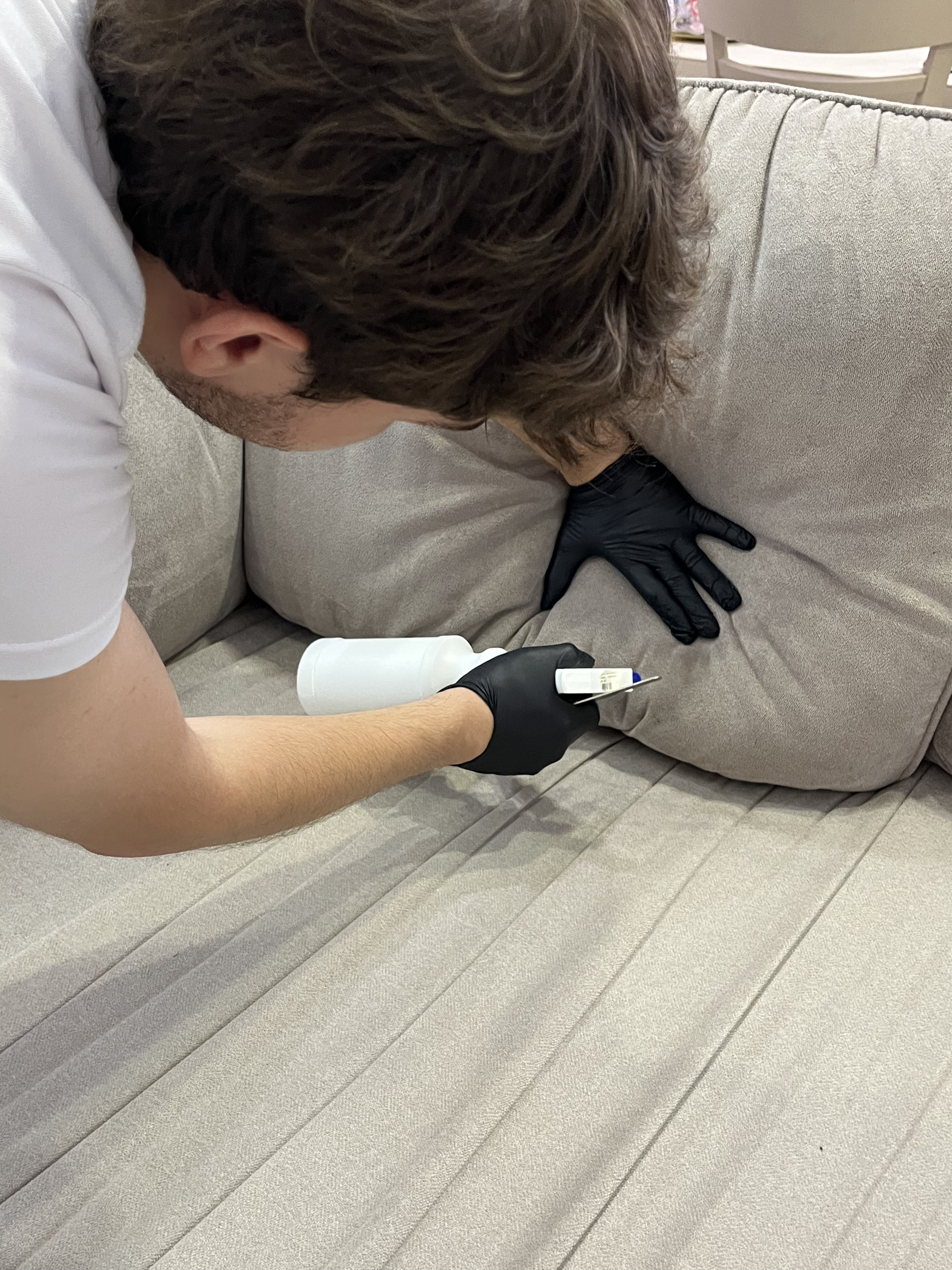 Индивидуальный подход: я приезжаю к вам и перед началом чистки оцениваю тип обивки и степень загрязнения. Никакой "общей" технологии — только правильный подбор химии после теста.