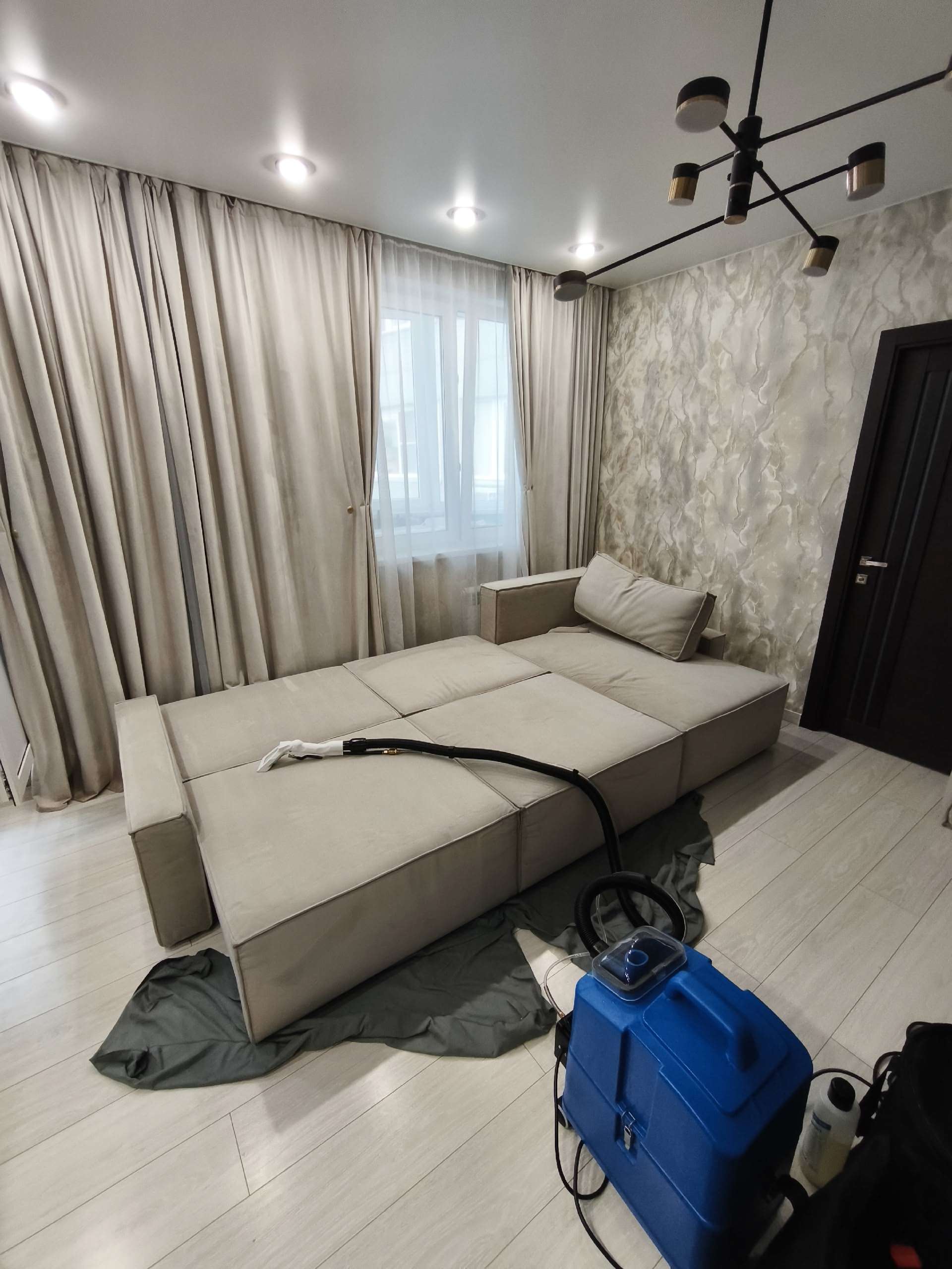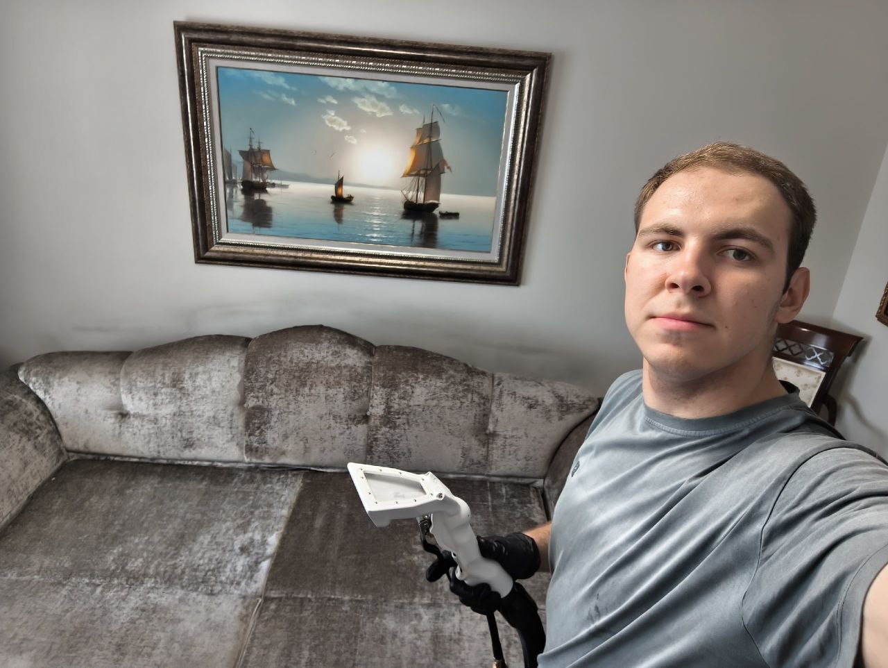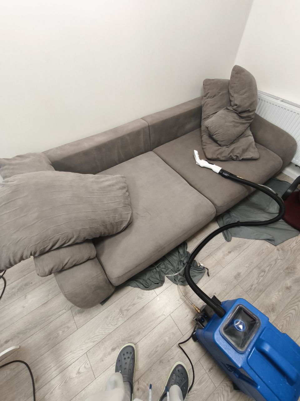 В среднем работа занимает от 1 до 3 часов, в зависимости от размера мебели и степени загрязнения. Например, стандартный диван (3 места) чищу примерно 2 часа. После чистки я продуваю обивку мощными фенами, чтобы ускорить высыхание.